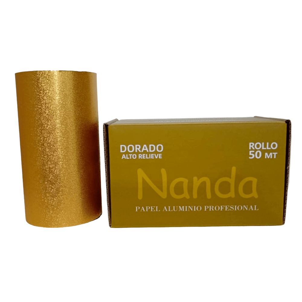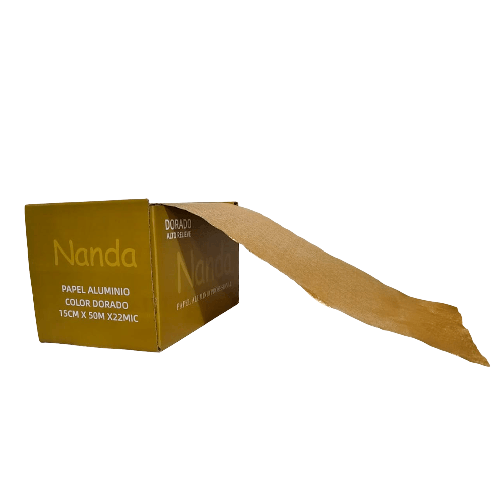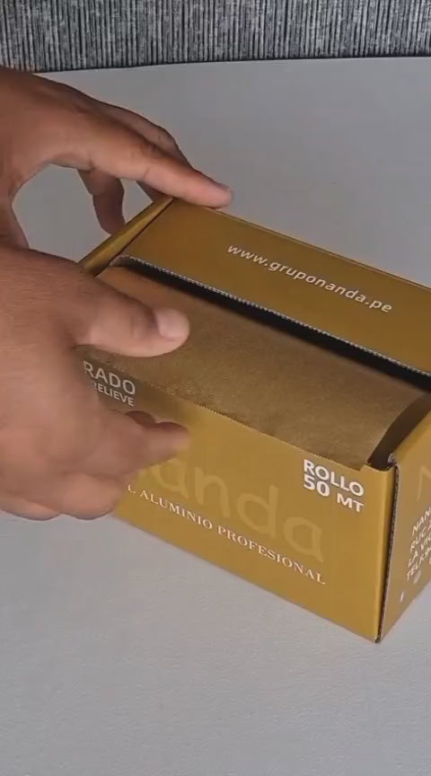Papel aluminio alto relieve dorado, Rollo de 15 cm de ancho x 50 metros de largo x 22 micras, es resistente y reutilizable, caja con cortador para cortar el largo que desee.